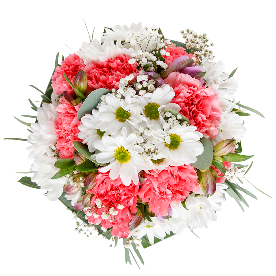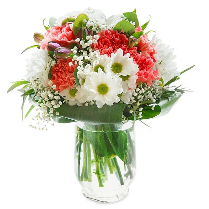 Bring a touch of grace and beauty to your loved one's day with our Charming White & Pink Floral Arrangement. This exquisite bouquet combines pristine snow-white chrysanthemums, airy gypsophila, tender light pink carnations, and rich aspidistra leaves, meticulously arranged to create a stunning visual masterpiece.